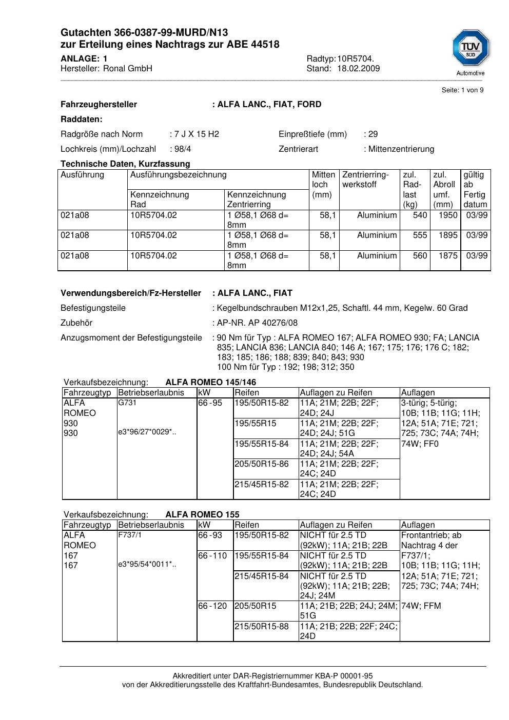 Dieses Gutachten (abe) bezieht sich auf die Alufelge brand-ronal 10R5704 in der Ausführung 7Jx15 ET 0, Mittenloch 0 mm (KBA 44518). Im PDF findest du typischerweise zulässige Reifengrößen, Auflagen/Anbauhinweise und – je nach Dokument – Hinweise zur Eintragung.