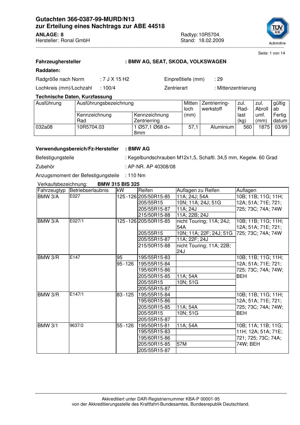Dieses Gutachten (abe) bezieht sich auf die Alufelge brand-ronal 10R5704 in der Ausführung 7Jx15 ET 0, Mittenloch 0 mm (KBA 44518). Im PDF findest du typischerweise zulässige Reifengrößen, Auflagen/Anbauhinweise und – je nach Dokument – Hinweise zur Eintragung.