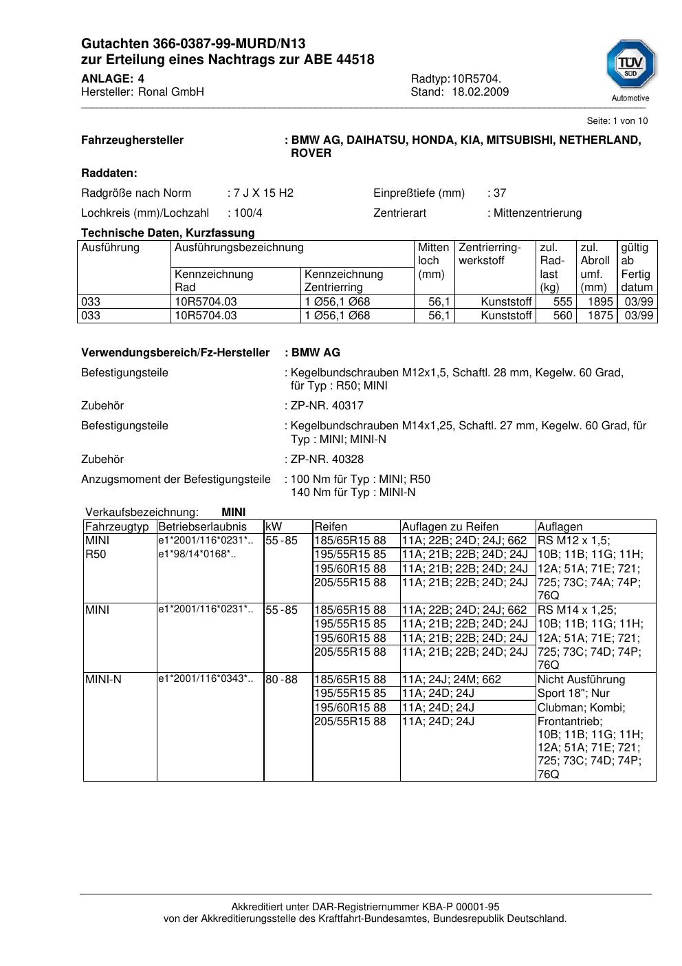 Dieses Gutachten (abe) bezieht sich auf die Alufelge Ronal 10R5704 in der Ausführung 7Jx15 ET 0, Mittenloch 0 mm (KBA 44518). Im PDF findest du typischerweise zulässige Reifengrößen, Auflagen/Anbauhinweise und – je nach Dokument – Hinweise zur Eintragung.