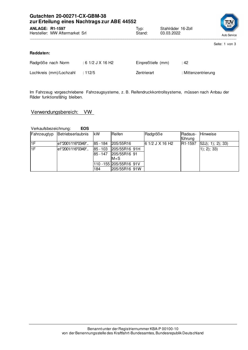 Dieses Gutachten (abe) bezieht sich auf die Alufelge ATS Stahlr in der Ausführung 2Jx16 ET 0, Mittenloch 0 mm (KBA 44552). Im PDF findest du typischerweise zulässige Reifengrößen, Auflagen/Anbauhinweise und – je nach Dokument – Hinweise zur Eintragung.