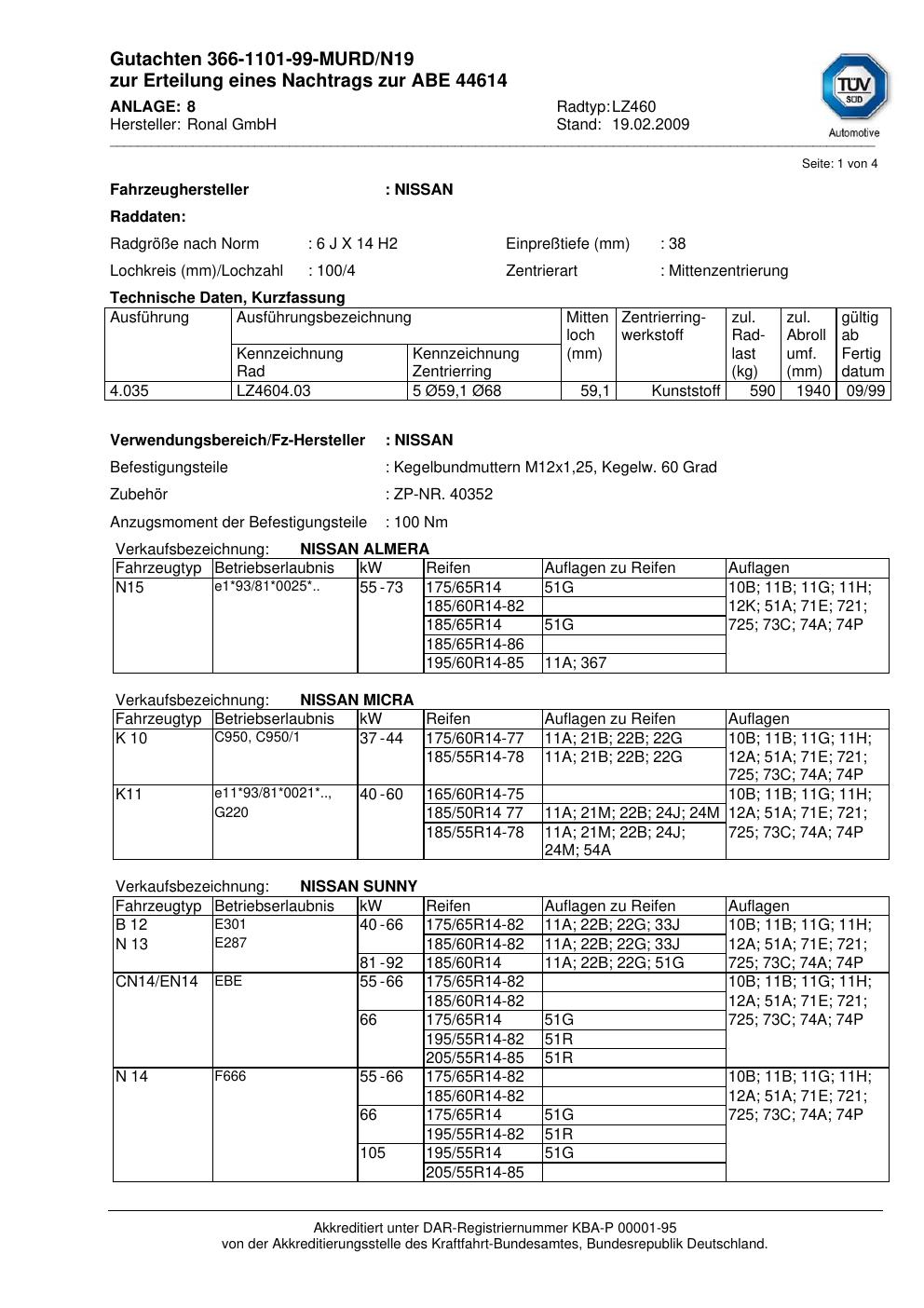Dieses Gutachten (abe) bezieht sich auf die Alufelge Ronal LZ460 in der Ausführung 6Jx14 ET 0, Mittenloch 0 mm (KBA 44614). Im PDF findest du typischerweise zulässige Reifengrößen, Auflagen/Anbauhinweise und – je nach Dokument – Hinweise zur Eintragung.
