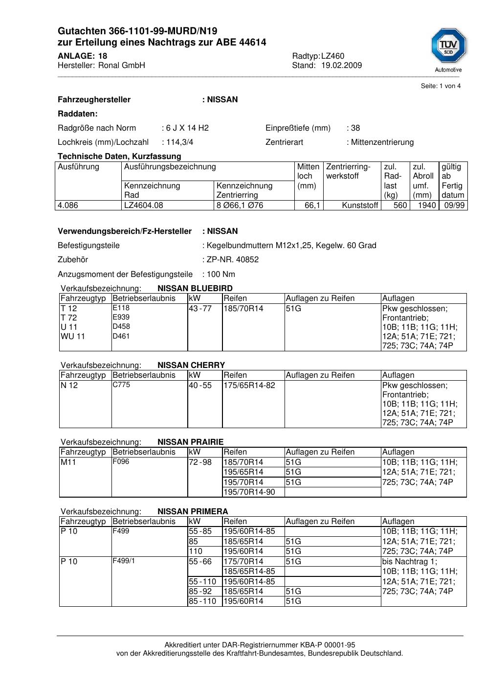 Dieses Gutachten (abe) bezieht sich auf die Alufelge Ronal LZ460 in der Ausführung 6Jx14 ET 0, Mittenloch 0 mm (KBA 44614). Im PDF findest du typischerweise zulässige Reifengrößen, Auflagen/Anbauhinweise und – je nach Dokument – Hinweise zur Eintragung.