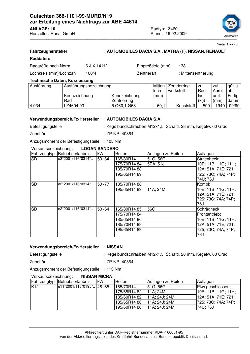 Dieses Gutachten (abe) bezieht sich auf die Alufelge Ronal LZ460 in der Ausführung 6Jx14 ET 0, Mittenloch 0 mm (KBA 44614). Im PDF findest du typischerweise zulässige Reifengrößen, Auflagen/Anbauhinweise und – je nach Dokument – Hinweise zur Eintragung.