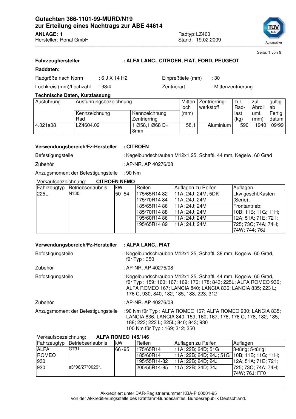 Dieses Gutachten (abe) bezieht sich auf die Alufelge brand-ronal LZ460 in der Ausführung 6Jx14 ET 0, Mittenloch 0 mm (KBA 44614). Im PDF findest du typischerweise zulässige Reifengrößen, Auflagen/Anbauhinweise und – je nach Dokument – Hinweise zur Eintragung.