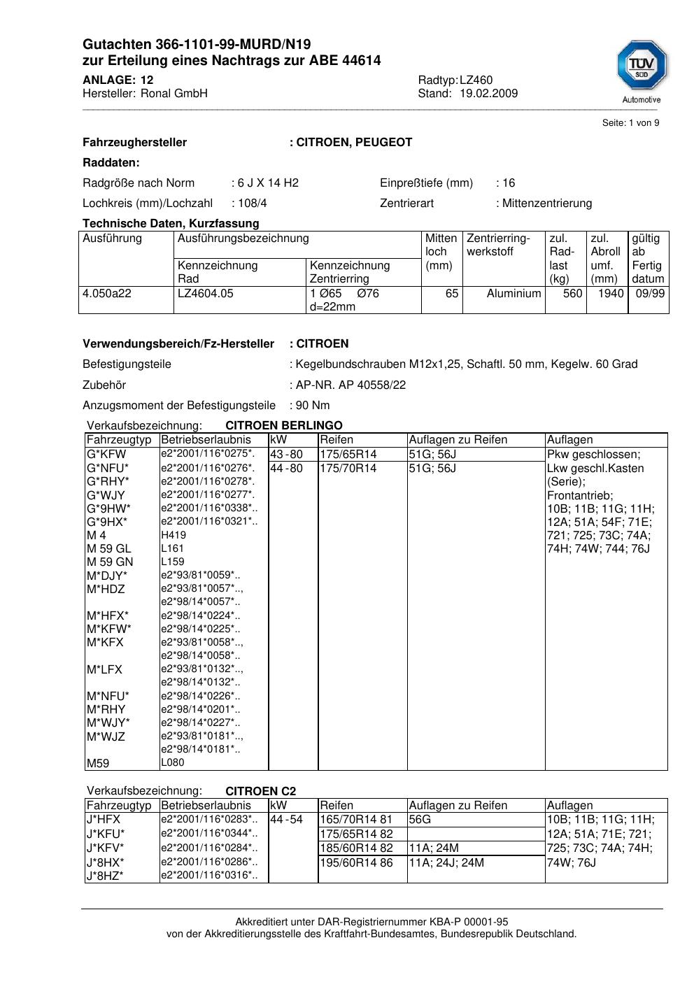 Dieses Gutachten (abe) bezieht sich auf die Alufelge brand-ronal LZ460 in der Ausführung 6Jx14 ET 0, Mittenloch 0 mm (KBA 44614). Im PDF findest du typischerweise zulässige Reifengrößen, Auflagen/Anbauhinweise und – je nach Dokument – Hinweise zur Eintragung.