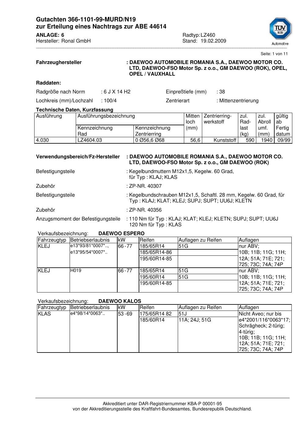 Dieses Gutachten (abe) bezieht sich auf die Alufelge Ronal LZ460 in der Ausführung 6Jx14 ET 0, Mittenloch 0 mm (KBA 44614). Im PDF findest du typischerweise zulässige Reifengrößen, Auflagen/Anbauhinweise und – je nach Dokument – Hinweise zur Eintragung.
