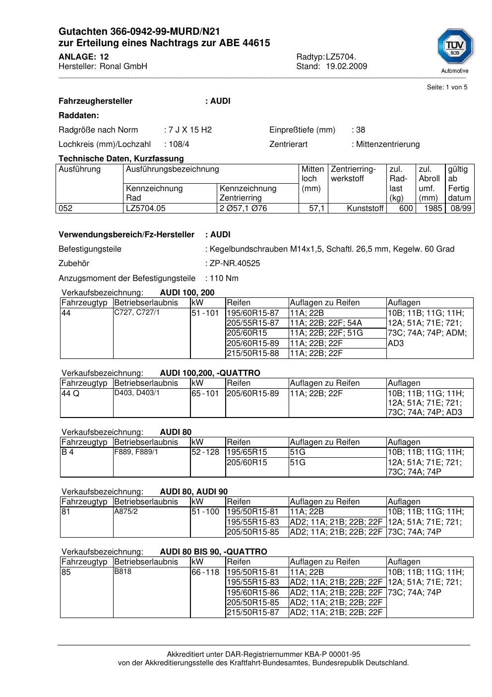 Felgengutachten / abe für Alufelgen Ronal LZ5704 (7Jx15 ET 0, Mittenloch 0 mm) mit KBA 44615 (Zertifikatsnummer 44615). Hier kostenlos als PDF herunterladen. Der Download-Link ist 24 Stunden gültig und kann bis zu zwei Mal verwendet werden.