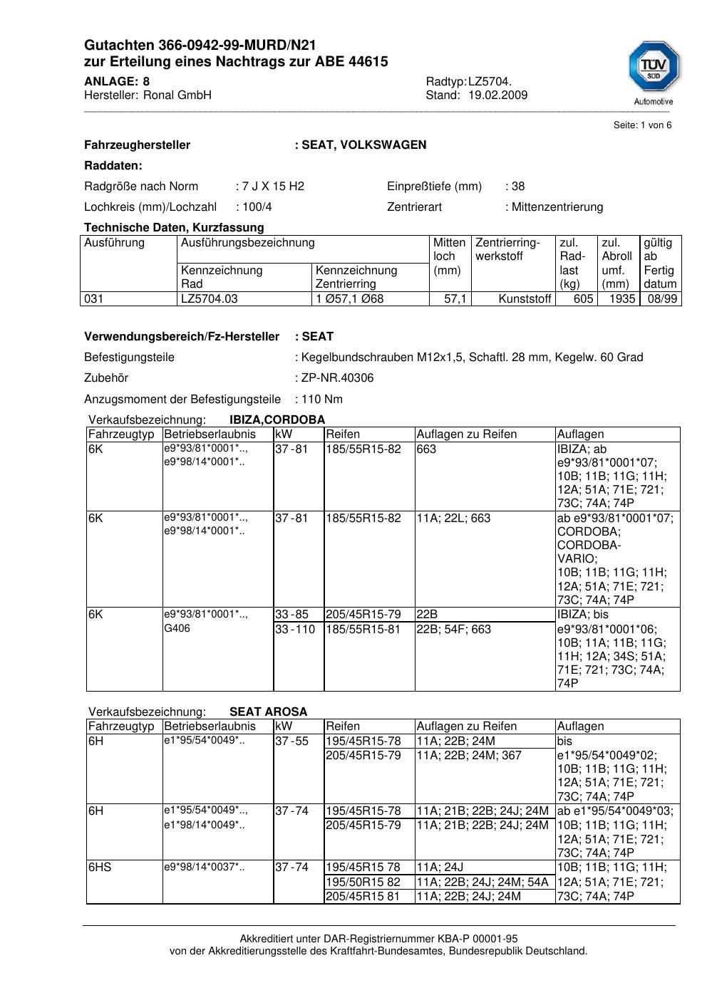 Dieses Gutachten (abe) bezieht sich auf die Alufelge Ronal LZ5704 in der Ausführung 7Jx15 ET 0, Mittenloch 0 mm (KBA 44615). Im PDF findest du typischerweise zulässige Reifengrößen, Auflagen/Anbauhinweise und – je nach Dokument – Hinweise zur Eintragung.
