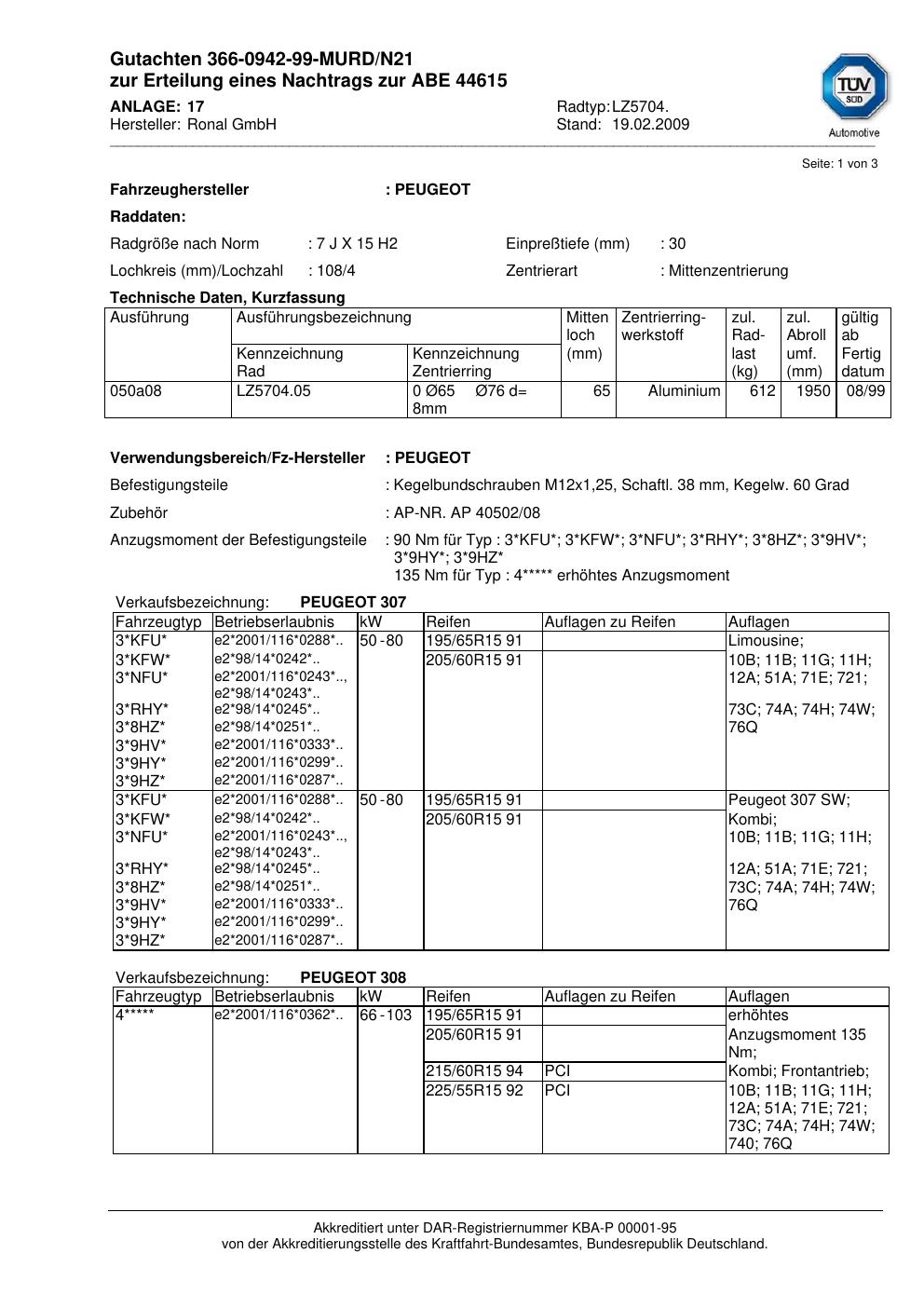 Dieses Gutachten (abe) bezieht sich auf die Alufelge Ronal LZ5704 in der Ausführung 7Jx15 ET 0, Mittenloch 0 mm (KBA 44615). Im PDF findest du typischerweise zulässige Reifengrößen, Auflagen/Anbauhinweise und – je nach Dokument – Hinweise zur Eintragung.