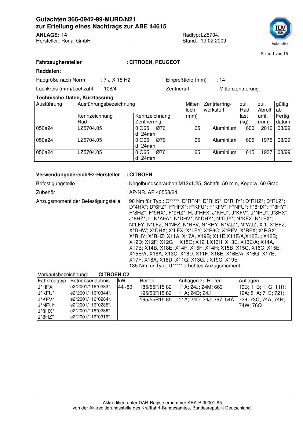 Dieses Gutachten (abe) bezieht sich auf die Alufelge Ronal LZ5704 in der Ausführung 7Jx15 ET 0, Mittenloch 0 mm (KBA 44615). Im PDF findest du typischerweise zulässige Reifengrößen, Auflagen/Anbauhinweise und – je nach Dokument – Hinweise zur Eintragung.