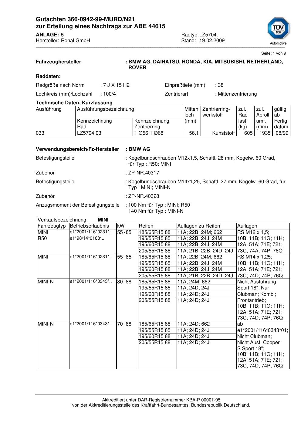 Dieses Gutachten (abe) bezieht sich auf die Alufelge Ronal LZ5704 in der Ausführung 7Jx15 ET 0, Mittenloch 0 mm (KBA 44615). Im PDF findest du typischerweise zulässige Reifengrößen, Auflagen/Anbauhinweise und – je nach Dokument – Hinweise zur Eintragung.