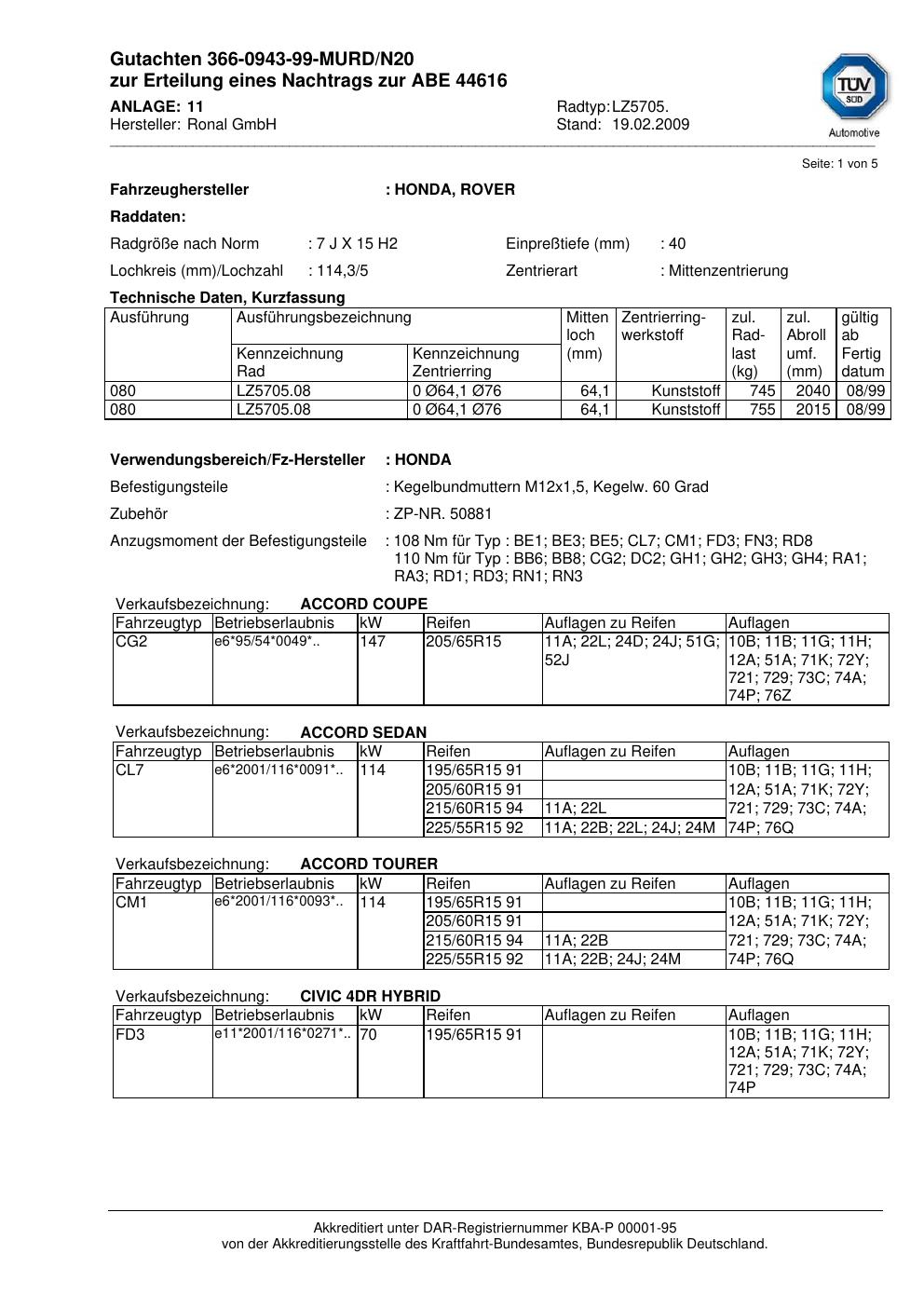Dieses Gutachten (abe) bezieht sich auf die Alufelge Ronal LZ5705 in der Ausführung 7Jx15 ET 0, Mittenloch 0 mm (KBA 44616). Im PDF findest du typischerweise zulässige Reifengrößen, Auflagen/Anbauhinweise und – je nach Dokument – Hinweise zur Eintragung.