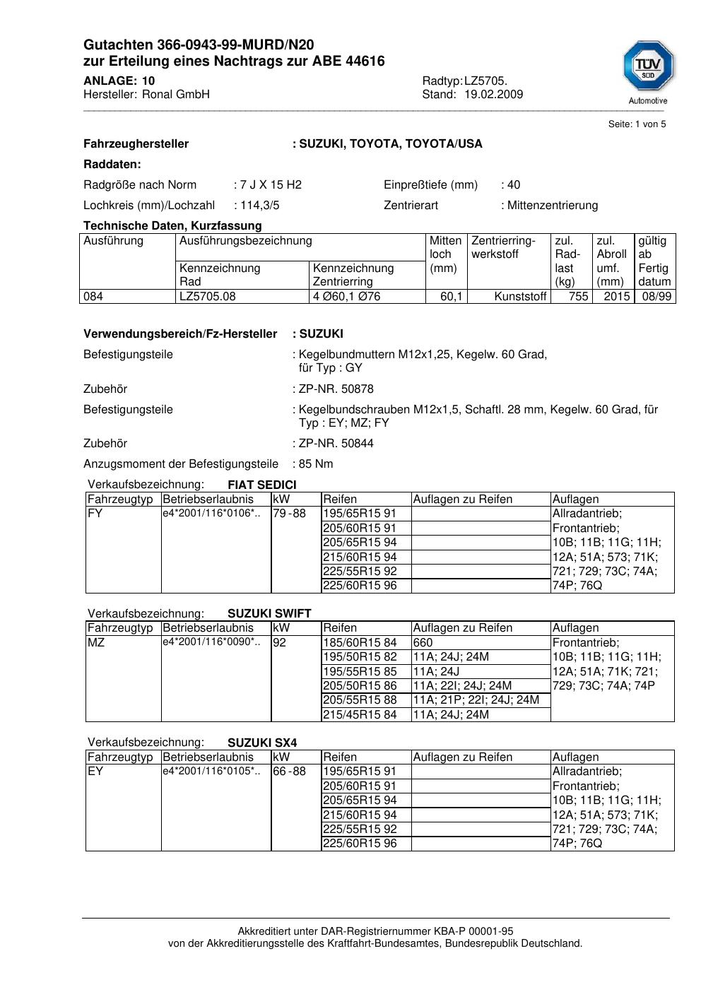 Dieses Gutachten (abe) bezieht sich auf die Alufelge Ronal LZ5705 in der Ausführung 7Jx15 ET 0, Mittenloch 0 mm (KBA 44616). Im PDF findest du typischerweise zulässige Reifengrößen, Auflagen/Anbauhinweise und – je nach Dokument – Hinweise zur Eintragung.