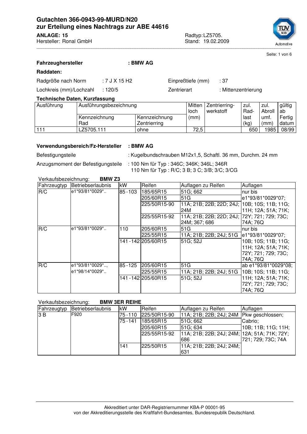 Dieses Gutachten (abe) bezieht sich auf die Alufelge Ronal LZ5705 in der Ausführung 7Jx15 ET 0, Mittenloch 0 mm (KBA 44616). Im PDF findest du typischerweise zulässige Reifengrößen, Auflagen/Anbauhinweise und – je nach Dokument – Hinweise zur Eintragung.
