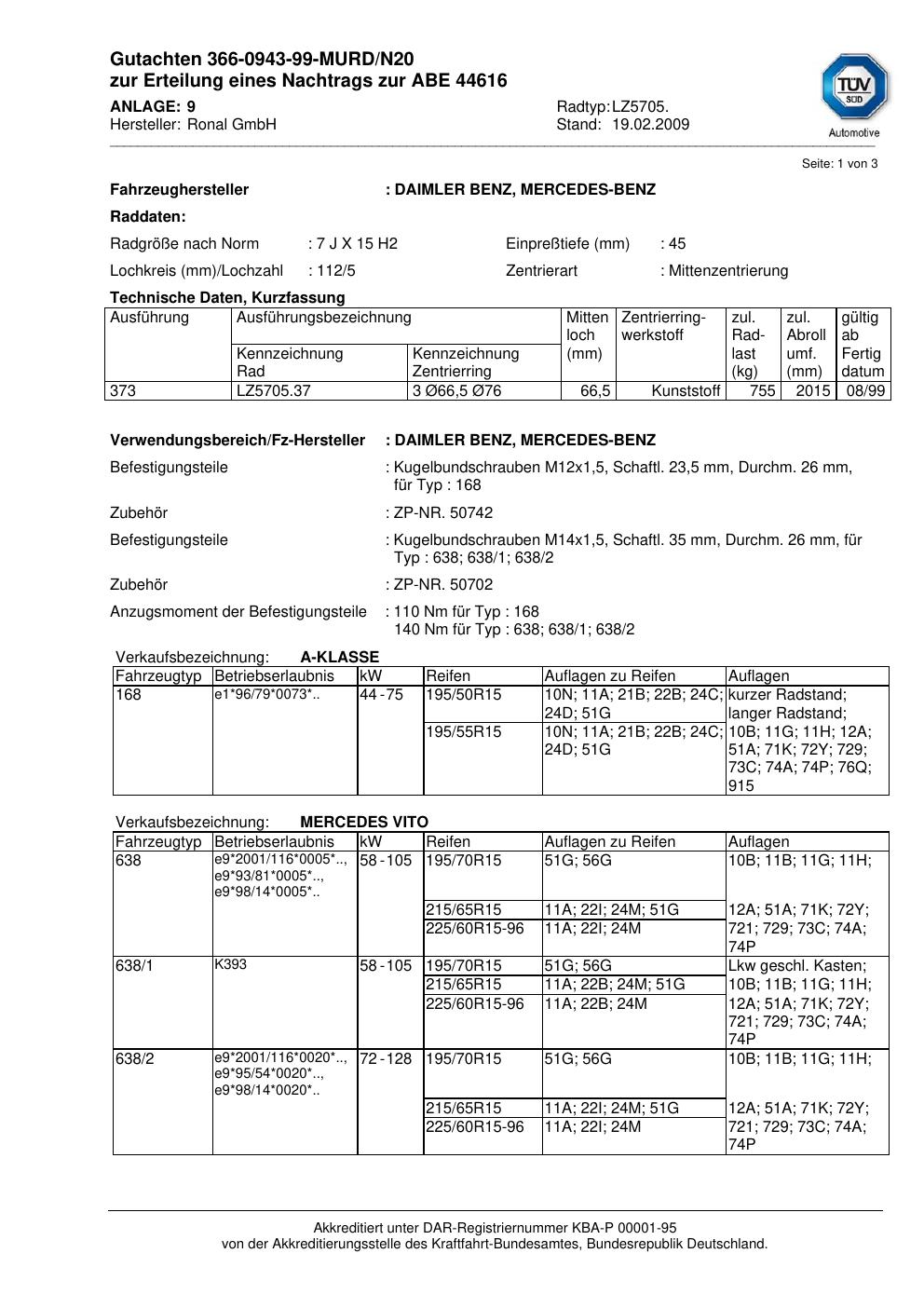 Dieses Gutachten (abe) bezieht sich auf die Alufelge Ronal LZ5705 in der Ausführung 7Jx15 ET 0, Mittenloch 0 mm (KBA 44616). Im PDF findest du typischerweise zulässige Reifengrößen, Auflagen/Anbauhinweise und – je nach Dokument – Hinweise zur Eintragung.