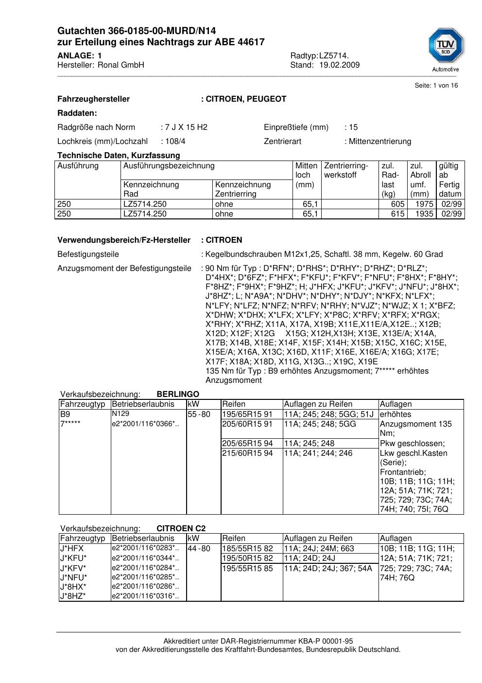 Dieses Gutachten (abe) bezieht sich auf die Alufelge Ronal LZ5714 in der Ausführung 7Jx15 ET 0, Mittenloch 0 mm (KBA 44617). Im PDF findest du typischerweise zulässige Reifengrößen, Auflagen/Anbauhinweise und – je nach Dokument – Hinweise zur Eintragung.