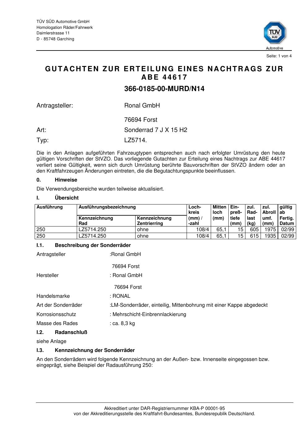 Dieses Gutachten (abe) bezieht sich auf die Alufelge Ronal LZ5714 in der Ausführung 7Jx15 ET 0, Mittenloch 0 mm (KBA 44617). Im PDF findest du typischerweise zulässige Reifengrößen, Auflagen/Anbauhinweise und – je nach Dokument – Hinweise zur Eintragung.
