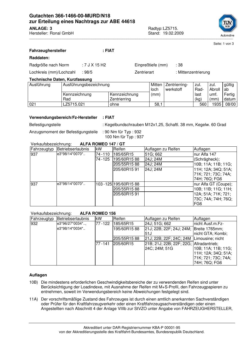Dieses Gutachten (abe) bezieht sich auf die Alufelge Ronal LZ5715 in der Ausführung 7Jx15 ET 0, Mittenloch 0 mm (KBA 44618). Im PDF findest du typischerweise zulässige Reifengrößen, Auflagen/Anbauhinweise und – je nach Dokument – Hinweise zur Eintragung.