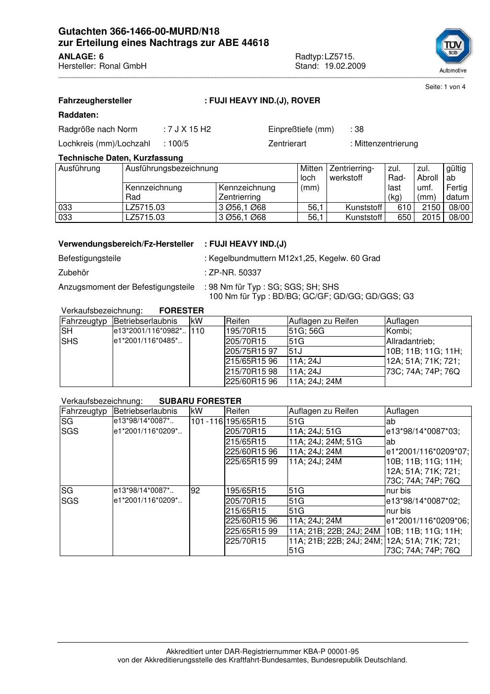 Dieses Gutachten (abe) bezieht sich auf die Alufelge Ronal LZ5715 in der Ausführung 7Jx15 ET 0, Mittenloch 0 mm (KBA 44618). Im PDF findest du typischerweise zulässige Reifengrößen, Auflagen/Anbauhinweise und – je nach Dokument – Hinweise zur Eintragung.