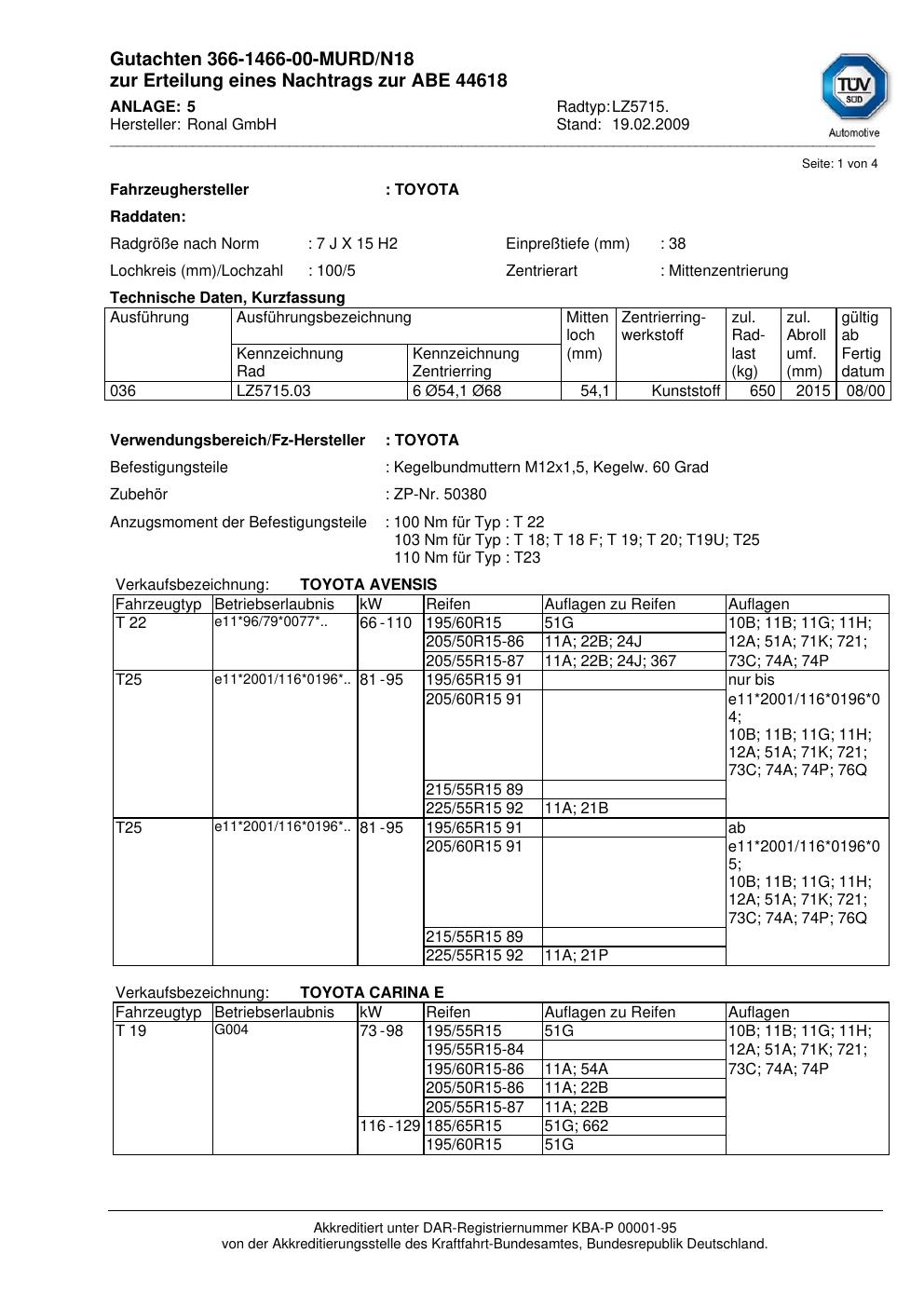 Dieses Gutachten (abe) bezieht sich auf die Alufelge Ronal LZ5715 in der Ausführung 7Jx15 ET 0, Mittenloch 0 mm (KBA 44618). Im PDF findest du typischerweise zulässige Reifengrößen, Auflagen/Anbauhinweise und – je nach Dokument – Hinweise zur Eintragung.