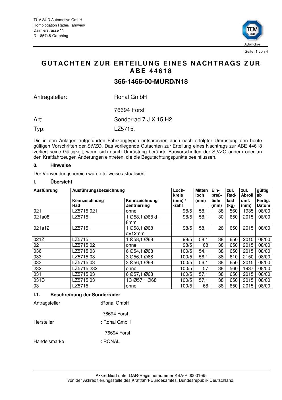 Dieses Gutachten (abe) bezieht sich auf die Alufelge Ronal LZ5715 in der Ausführung 7Jx15 ET 0, Mittenloch 0 mm (KBA 44618). Im PDF findest du typischerweise zulässige Reifengrößen, Auflagen/Anbauhinweise und – je nach Dokument – Hinweise zur Eintragung.