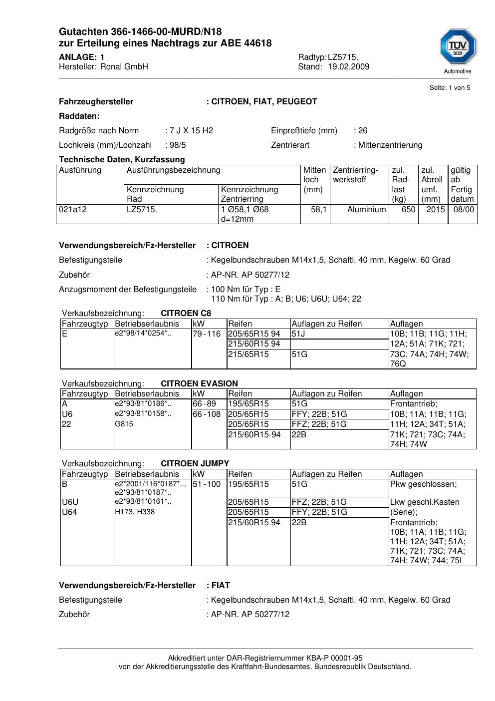 Dieses Gutachten (abe) bezieht sich auf die Alufelge brand-ronal LZ5715 in der Ausführung 7Jx15 ET 0, Mittenloch 0 mm (KBA 44618). Im PDF findest du typischerweise zulässige Reifengrößen, Auflagen/Anbauhinweise und – je nach Dokument – Hinweise zur Eintragung.