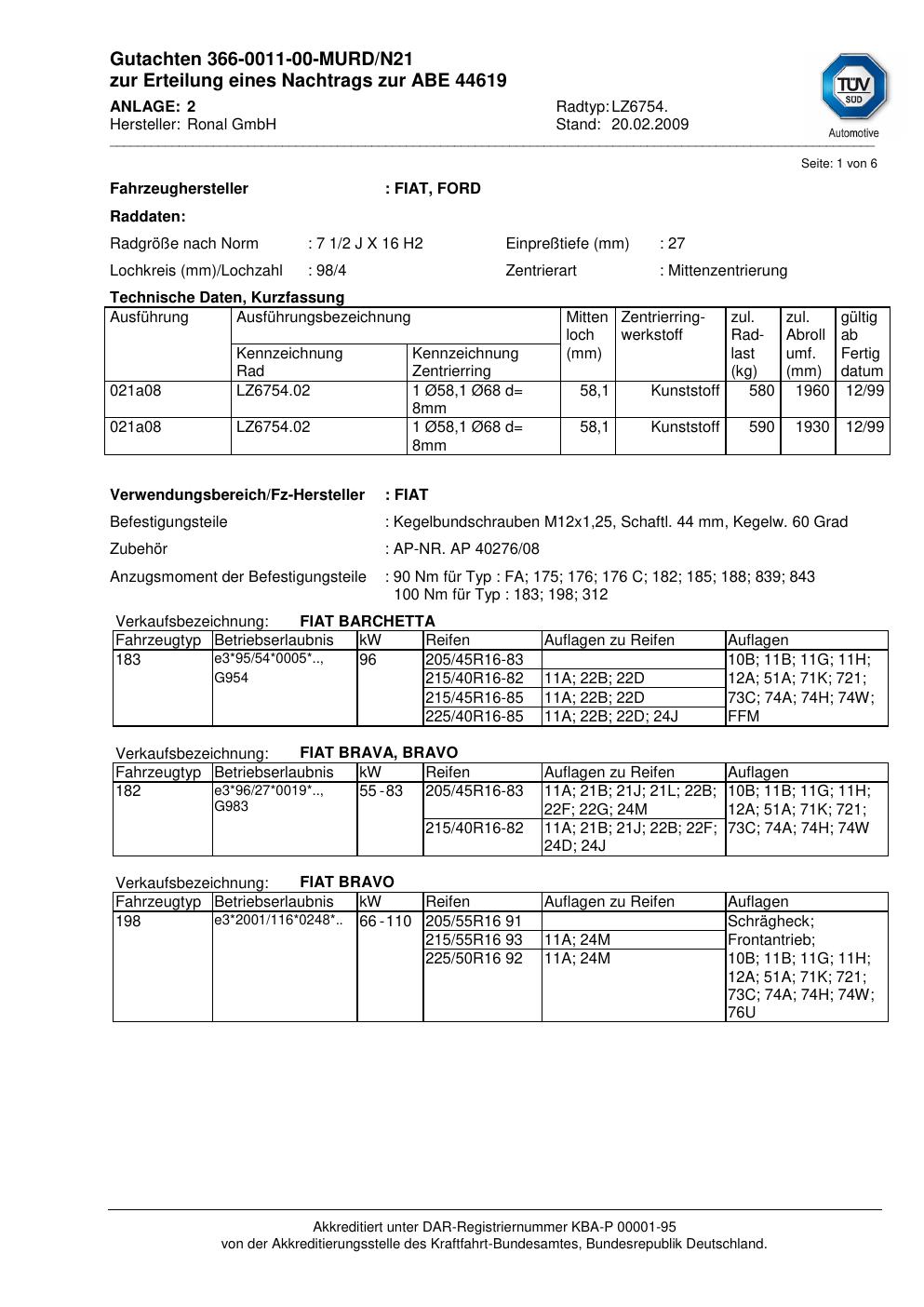 Dieses Gutachten (abe) bezieht sich auf die Alufelge Ronal LZ6754 in der Ausführung 2Jx16 ET 0, Mittenloch 0 mm (KBA 44619). Im PDF findest du typischerweise zulässige Reifengrößen, Auflagen/Anbauhinweise und – je nach Dokument – Hinweise zur Eintragung.