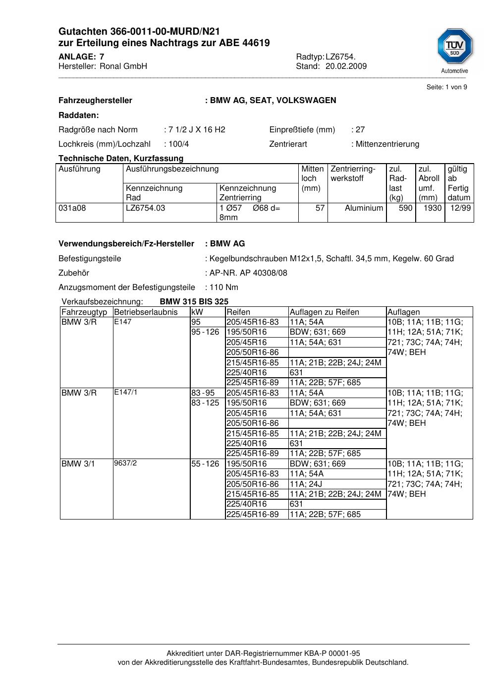 Dieses Gutachten (abe) bezieht sich auf die Alufelge Ronal LZ6754 in der Ausführung 2Jx16 ET 0, Mittenloch 0 mm (KBA 44619). Im PDF findest du typischerweise zulässige Reifengrößen, Auflagen/Anbauhinweise und – je nach Dokument – Hinweise zur Eintragung.