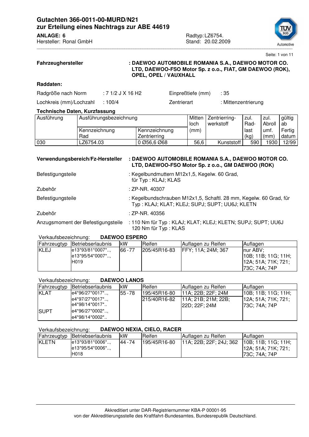 Dieses Gutachten (abe) bezieht sich auf die Alufelge Ronal LZ6754 in der Ausführung 2Jx16 ET 0, Mittenloch 0 mm (KBA 44619). Im PDF findest du typischerweise zulässige Reifengrößen, Auflagen/Anbauhinweise und – je nach Dokument – Hinweise zur Eintragung.