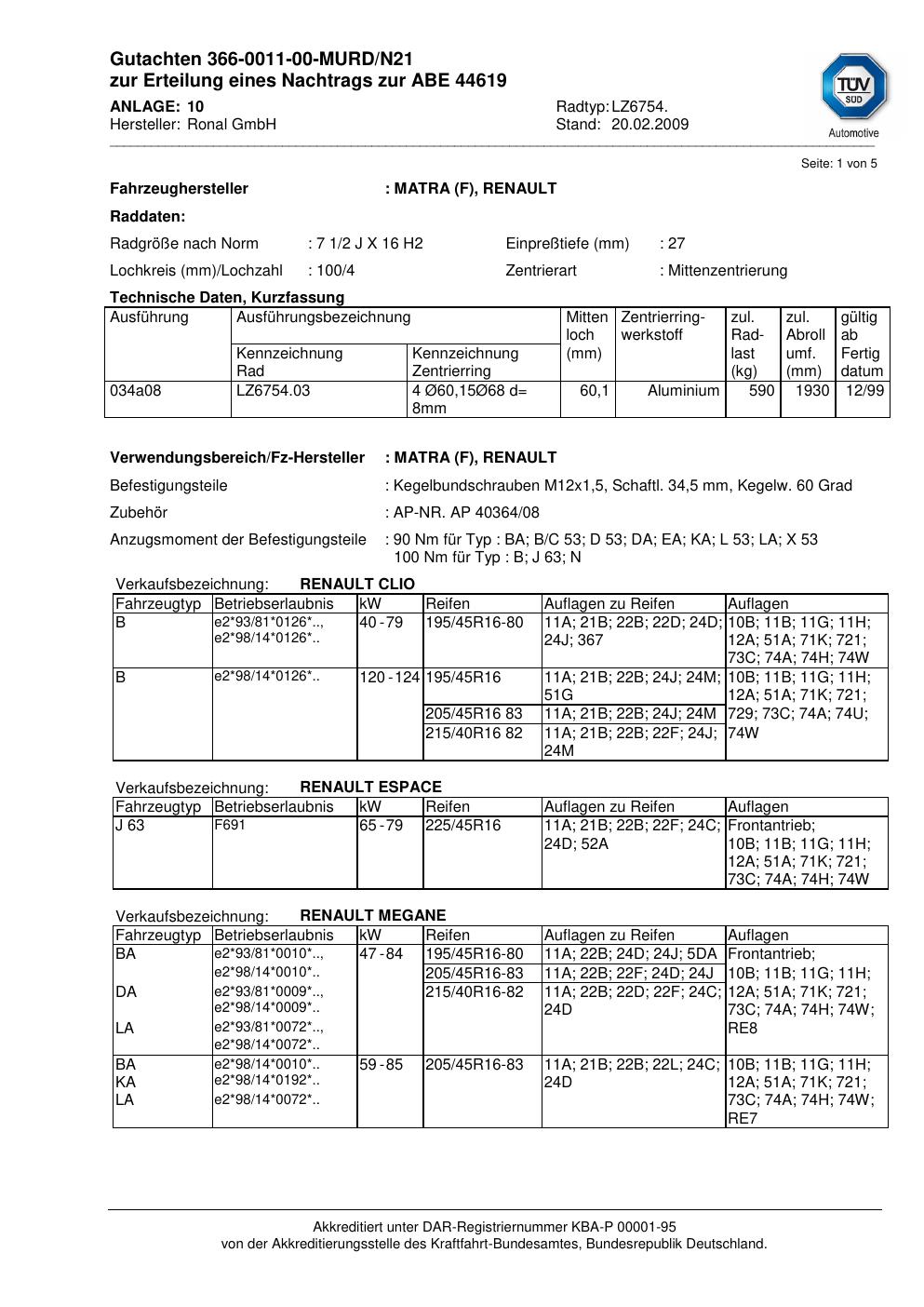 Dieses Gutachten (abe) bezieht sich auf die Alufelge brand-ronal LZ6754 in der Ausführung 2Jx16 ET 0, Mittenloch 0 mm (KBA 44619). Im PDF findest du typischerweise zulässige Reifengrößen, Auflagen/Anbauhinweise und – je nach Dokument – Hinweise zur Eintragung.