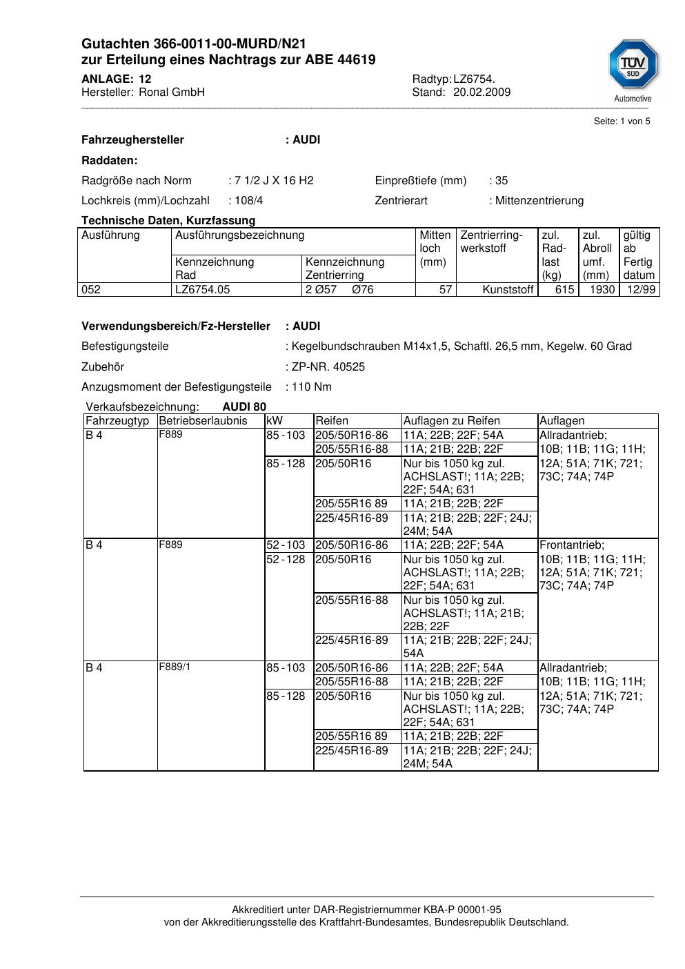 Dieses Gutachten (abe) bezieht sich auf die Alufelge Ronal LZ6754 in der Ausführung 2Jx16 ET 0, Mittenloch 0 mm (KBA 44619). Im PDF findest du typischerweise zulässige Reifengrößen, Auflagen/Anbauhinweise und – je nach Dokument – Hinweise zur Eintragung.