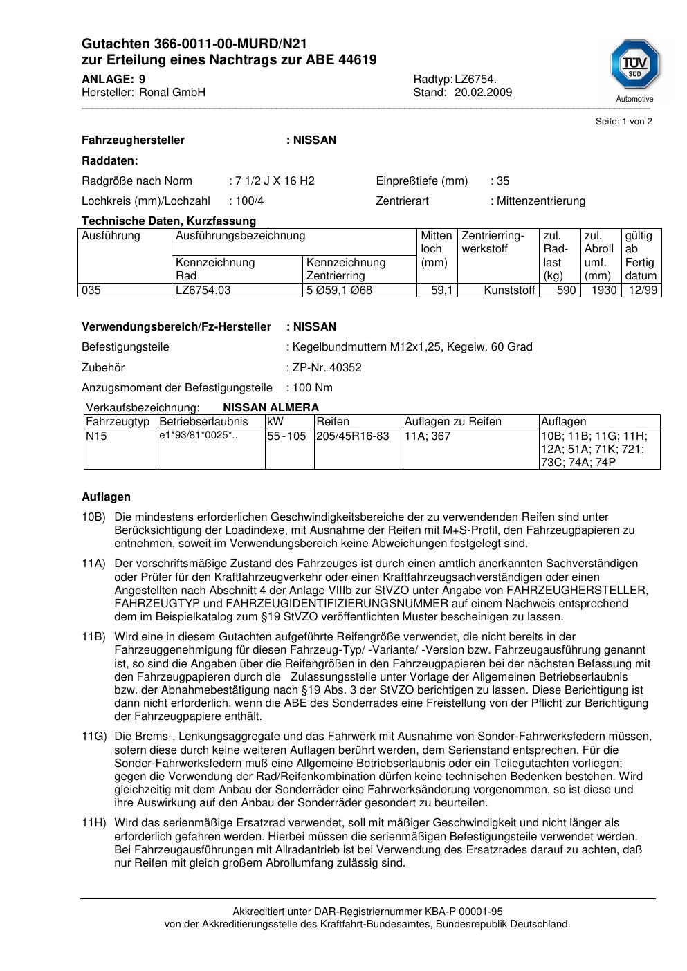 Dieses Gutachten (abe) bezieht sich auf die Alufelge Ronal LZ6754 in der Ausführung 2Jx16 ET 0, Mittenloch 0 mm (KBA 44619). Im PDF findest du typischerweise zulässige Reifengrößen, Auflagen/Anbauhinweise und – je nach Dokument – Hinweise zur Eintragung.