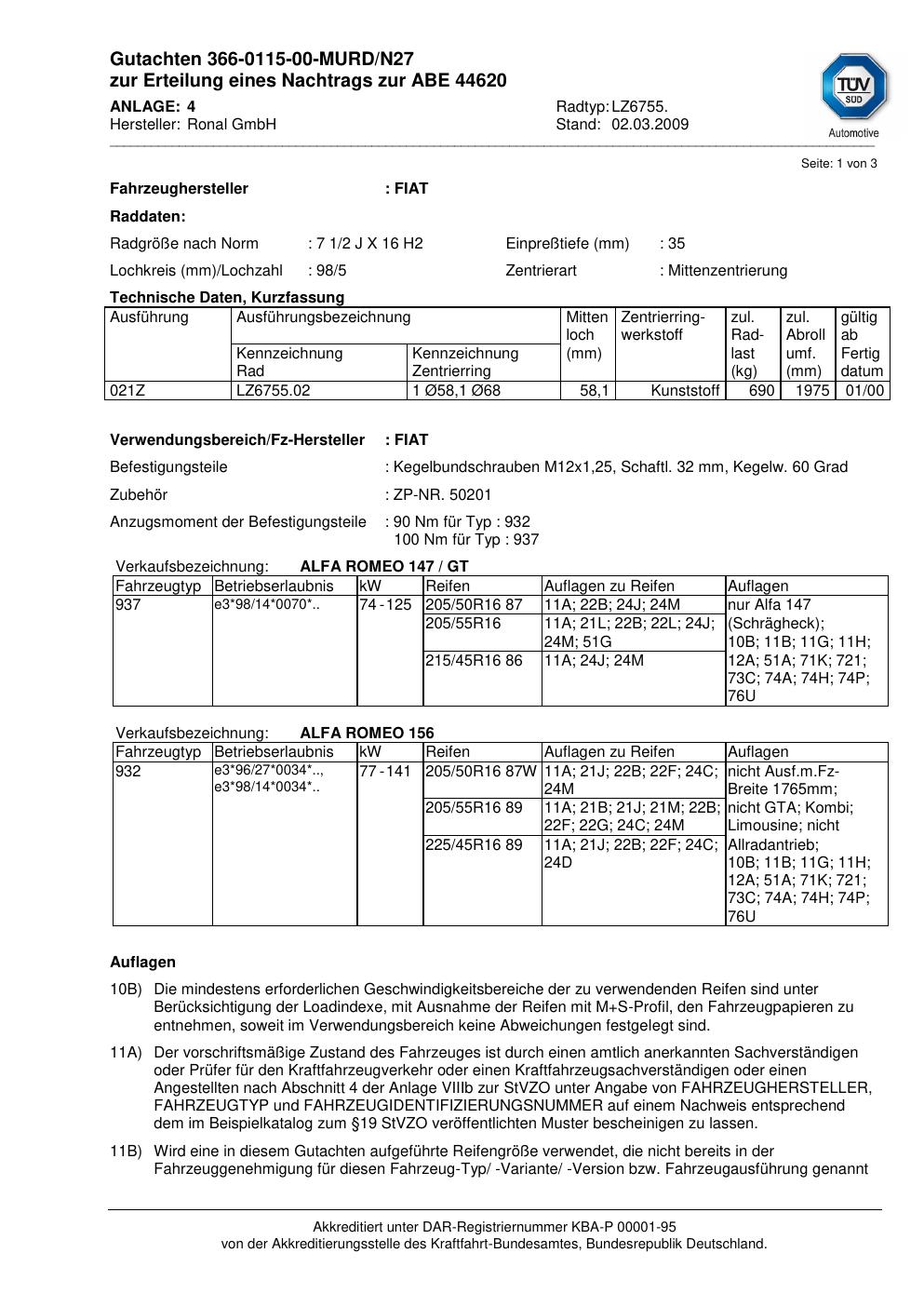 Dieses Gutachten (abe) bezieht sich auf die Alufelge Ronal LZ6755 in der Ausführung 2Jx16 ET 0, Mittenloch 0 mm (KBA 44620). Im PDF findest du typischerweise zulässige Reifengrößen, Auflagen/Anbauhinweise und – je nach Dokument – Hinweise zur Eintragung.