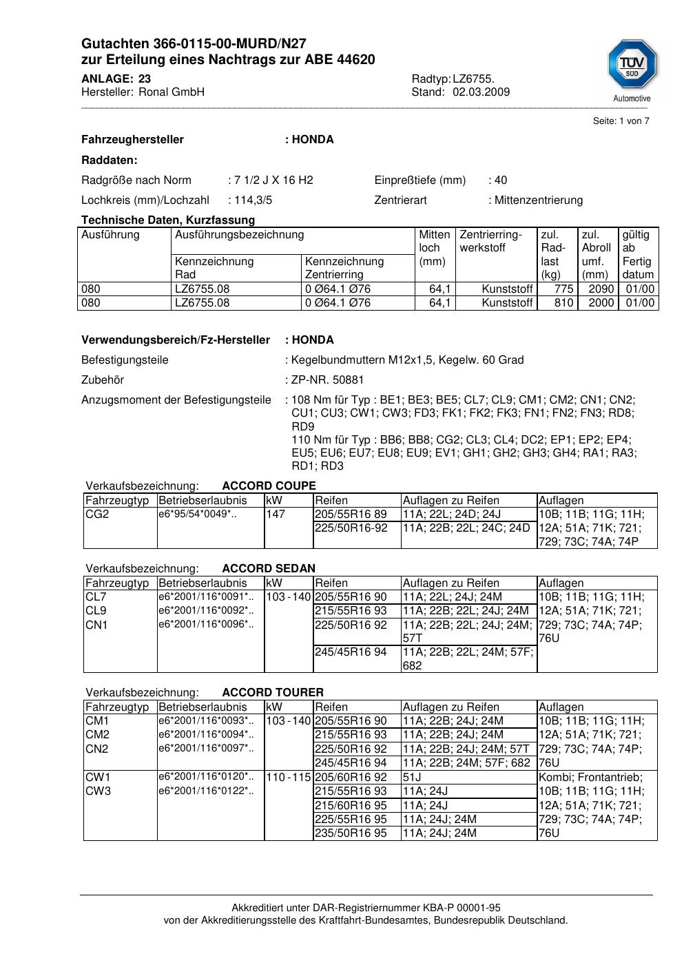 Dieses Gutachten (abe) bezieht sich auf die Alufelge Ronal LZ6755 in der Ausführung 2Jx16 ET 0, Mittenloch 0 mm (KBA 44620). Im PDF findest du typischerweise zulässige Reifengrößen, Auflagen/Anbauhinweise und – je nach Dokument – Hinweise zur Eintragung.