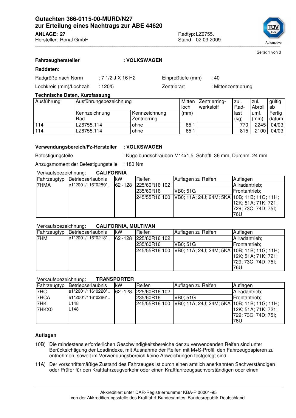 Dieses Gutachten (abe) bezieht sich auf die Alufelge Ronal LZ6755 in der Ausführung 2Jx16 ET 0, Mittenloch 0 mm (KBA 44620). Im PDF findest du typischerweise zulässige Reifengrößen, Auflagen/Anbauhinweise und – je nach Dokument – Hinweise zur Eintragung.