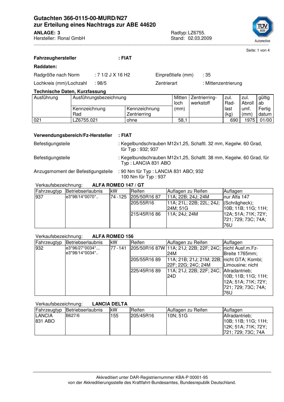 Dieses Gutachten (abe) bezieht sich auf die Alufelge Ronal LZ6755 in der Ausführung 2Jx16 ET 0, Mittenloch 0 mm (KBA 44620). Im PDF findest du typischerweise zulässige Reifengrößen, Auflagen/Anbauhinweise und – je nach Dokument – Hinweise zur Eintragung.