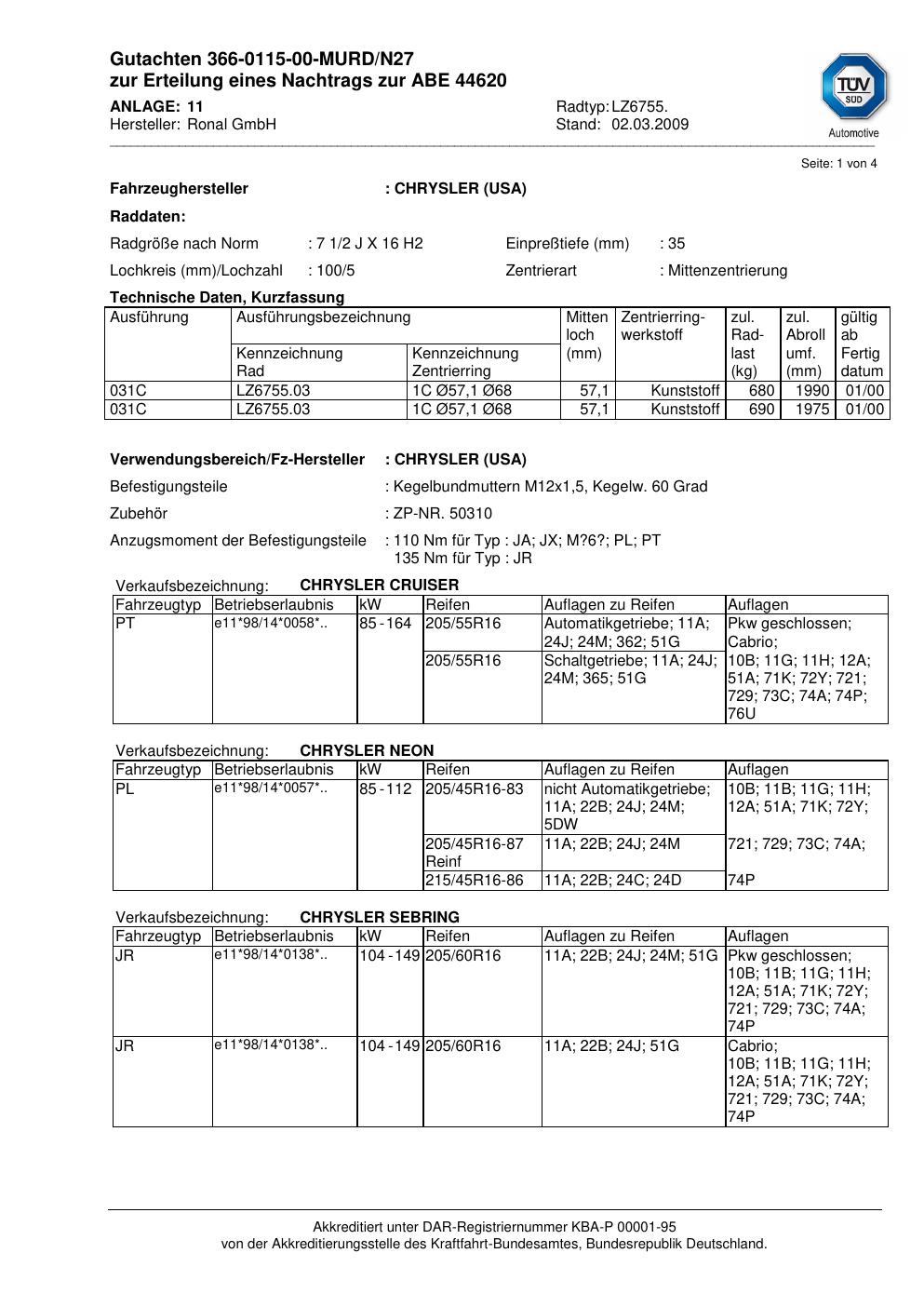 Dieses Gutachten (abe) bezieht sich auf die Alufelge Ronal LZ6755 in der Ausführung 2Jx16 ET 0, Mittenloch 0 mm (KBA 44620). Im PDF findest du typischerweise zulässige Reifengrößen, Auflagen/Anbauhinweise und – je nach Dokument – Hinweise zur Eintragung.