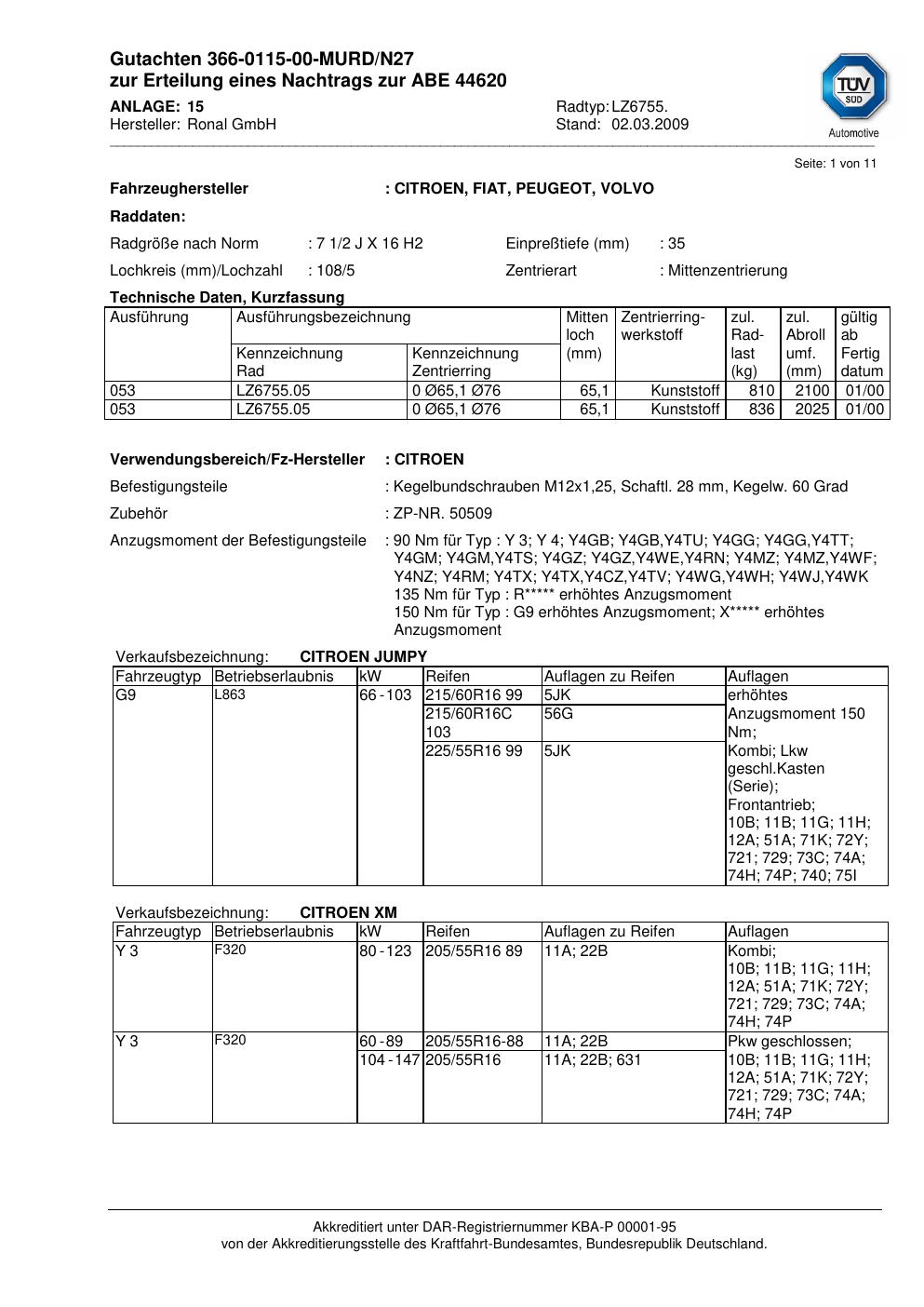 Dieses Gutachten (abe) bezieht sich auf die Alufelge Ronal LZ6755 in der Ausführung 2Jx16 ET 0, Mittenloch 0 mm (KBA 44620). Im PDF findest du typischerweise zulässige Reifengrößen, Auflagen/Anbauhinweise und – je nach Dokument – Hinweise zur Eintragung.