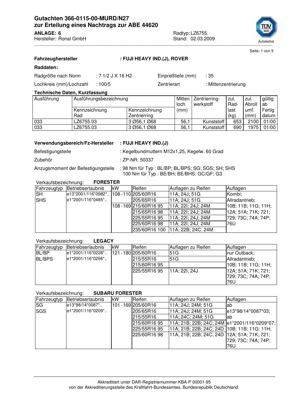 Dieses Gutachten (abe) bezieht sich auf die Alufelge Ronal LZ6755 in der Ausführung 2Jx16 ET 0, Mittenloch 0 mm (KBA 44620). Im PDF findest du typischerweise zulässige Reifengrößen, Auflagen/Anbauhinweise und – je nach Dokument – Hinweise zur Eintragung.