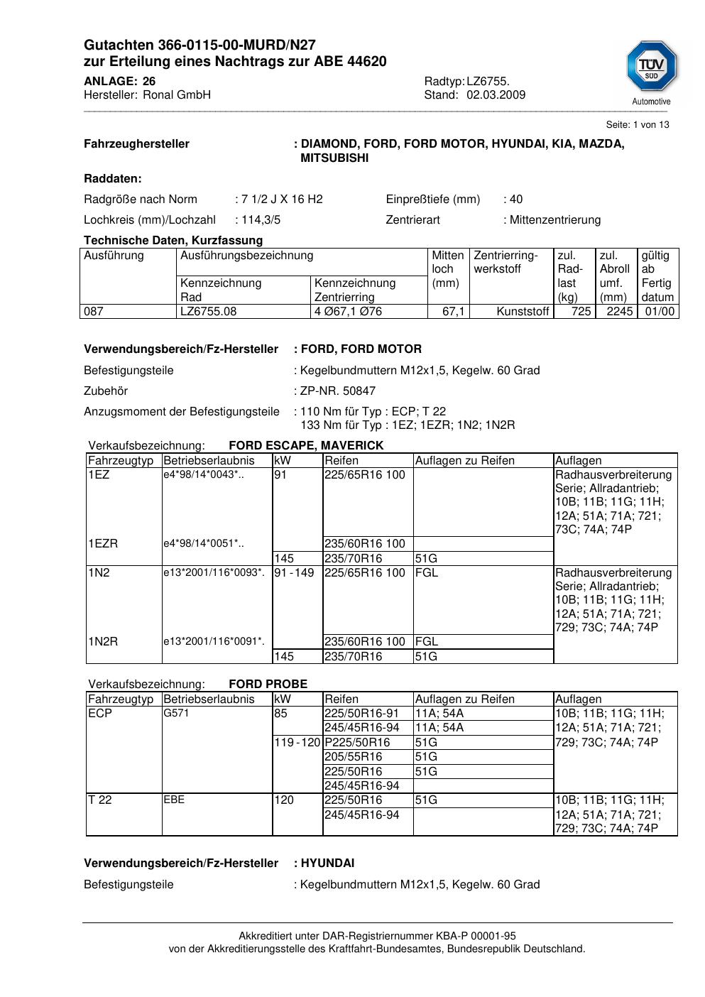 Dieses Gutachten (abe) bezieht sich auf die Alufelge Ronal LZ6755 in der Ausführung 2Jx16 ET 0, Mittenloch 0 mm (KBA 44620). Im PDF findest du typischerweise zulässige Reifengrößen, Auflagen/Anbauhinweise und – je nach Dokument – Hinweise zur Eintragung.