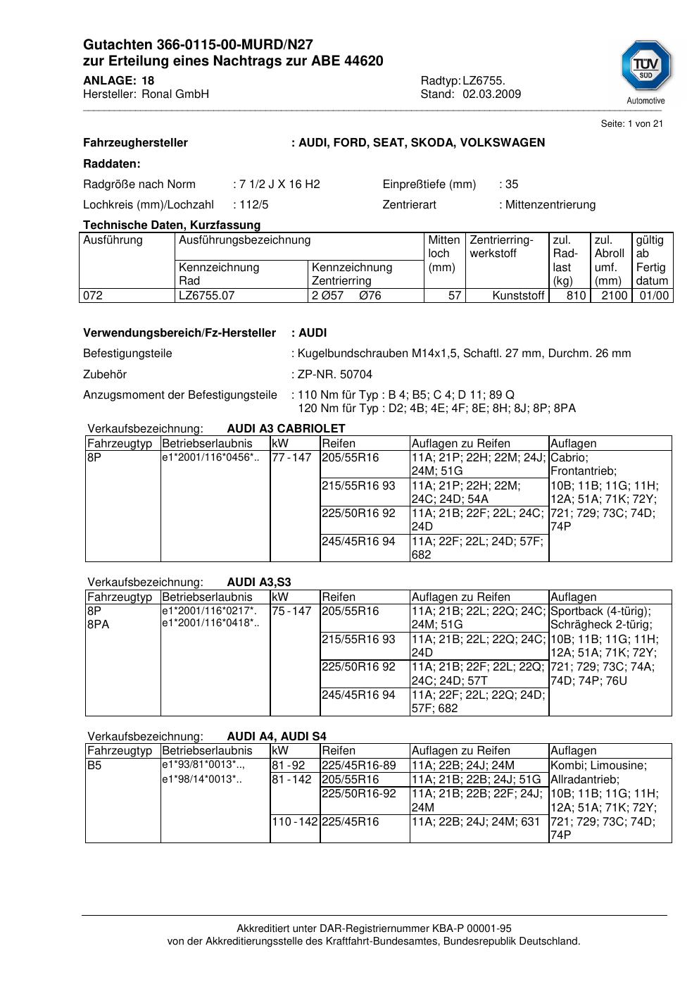 Dieses Gutachten (abe) bezieht sich auf die Alufelge Ronal LZ6755 in der Ausführung 2Jx16 ET 0, Mittenloch 0 mm (KBA 44620). Im PDF findest du typischerweise zulässige Reifengrößen, Auflagen/Anbauhinweise und – je nach Dokument – Hinweise zur Eintragung.