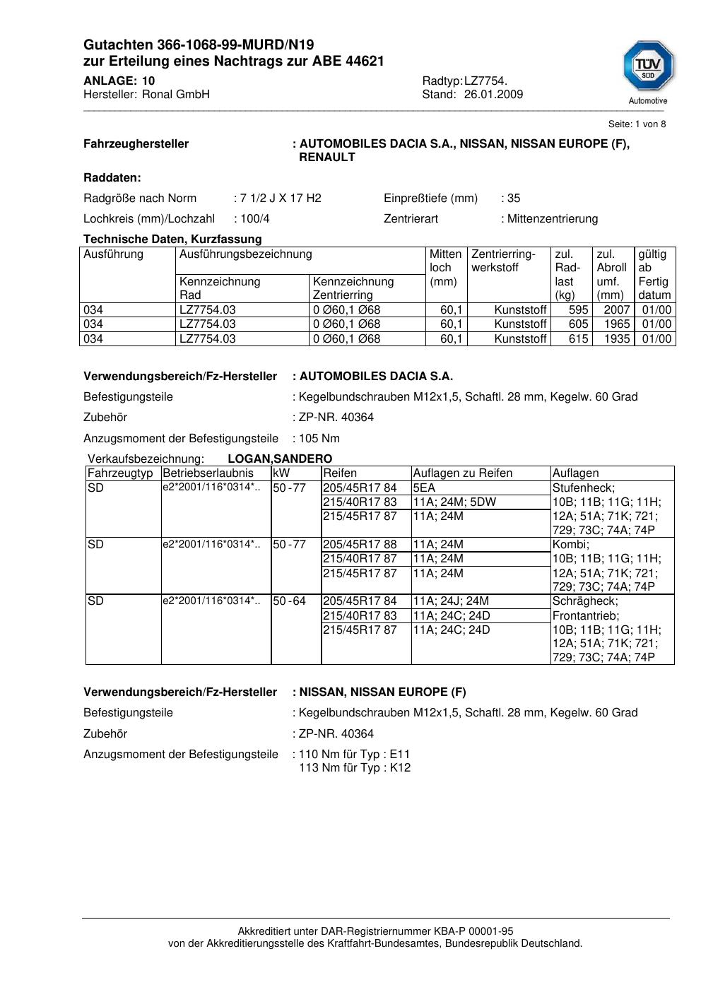 Dieses Gutachten (abe) bezieht sich auf die Alufelge Ronal LZ7754 in der Ausführung 2Jx17 ET 0, Mittenloch 0 mm (KBA 44621). Im PDF findest du typischerweise zulässige Reifengrößen, Auflagen/Anbauhinweise und – je nach Dokument – Hinweise zur Eintragung.