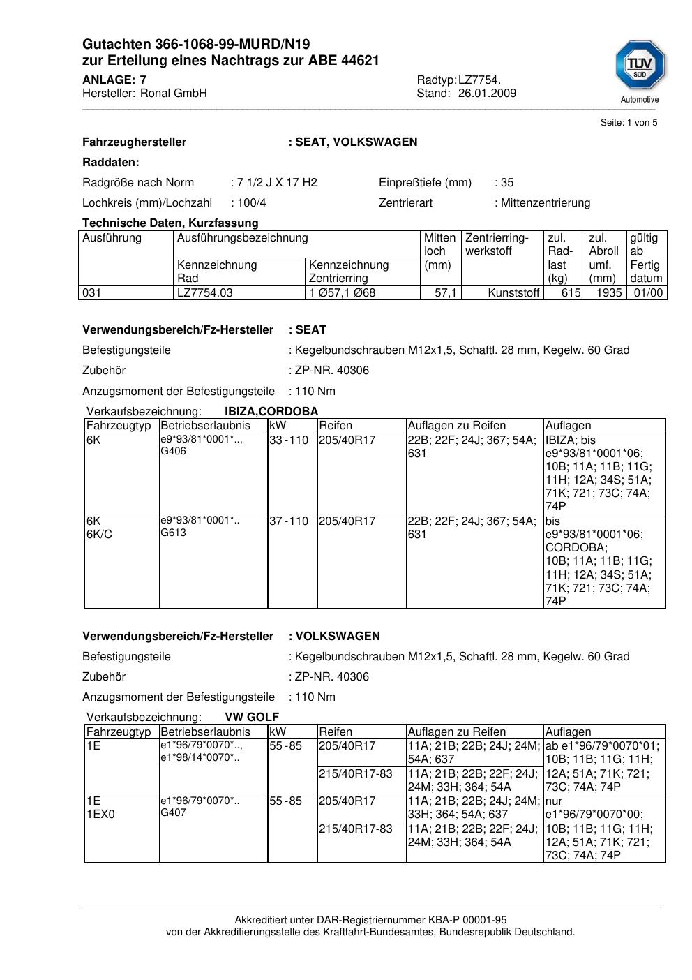 Dieses Gutachten (abe) bezieht sich auf die Alufelge Ronal LZ7754 in der Ausführung 2Jx17 ET 0, Mittenloch 0 mm (KBA 44621). Im PDF findest du typischerweise zulässige Reifengrößen, Auflagen/Anbauhinweise und – je nach Dokument – Hinweise zur Eintragung.