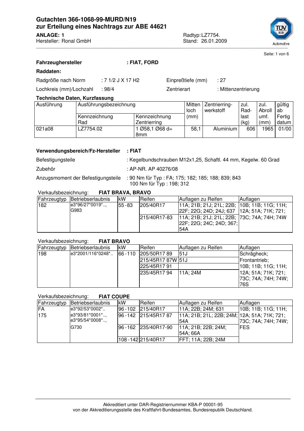 Dieses Gutachten (abe) bezieht sich auf die Alufelge brand-ronal LZ7754 in der Ausführung 2Jx17 ET 0, Mittenloch 0 mm (KBA 44621). Im PDF findest du typischerweise zulässige Reifengrößen, Auflagen/Anbauhinweise und – je nach Dokument – Hinweise zur Eintragung.