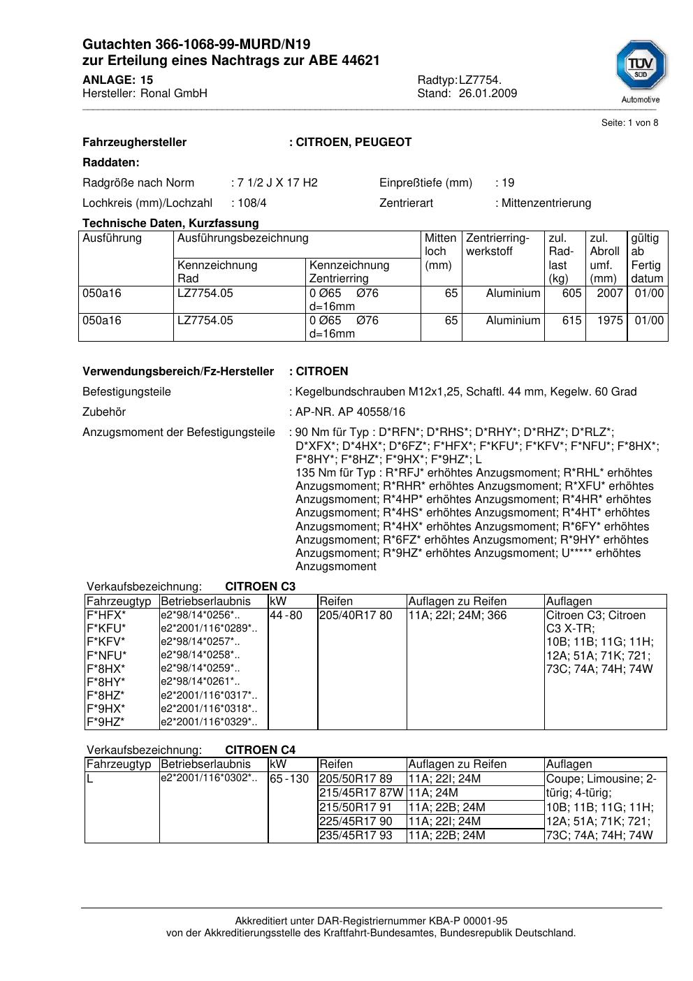 Dieses Gutachten (abe) bezieht sich auf die Alufelge brand-ronal LZ7754 in der Ausführung 2Jx17 ET 0, Mittenloch 0 mm (KBA 44621). Im PDF findest du typischerweise zulässige Reifengrößen, Auflagen/Anbauhinweise und – je nach Dokument – Hinweise zur Eintragung.