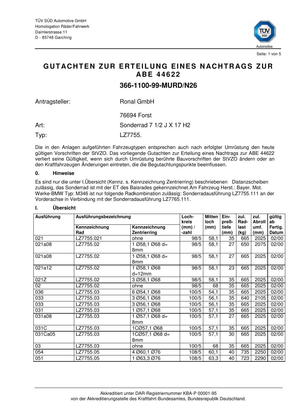 Dieses Gutachten (abe) bezieht sich auf die Alufelge ATS LZ7755 in der Ausführung 2Jx17 ET 0, Mittenloch 0 mm (KBA 44622). Im PDF findest du typischerweise zulässige Reifengrößen, Auflagen/Anbauhinweise und – je nach Dokument – Hinweise zur Eintragung.