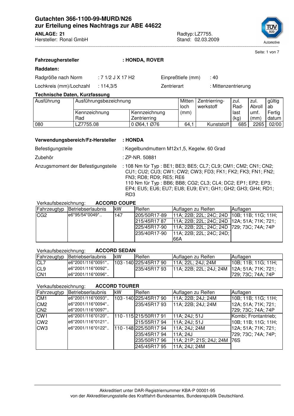 Dieses Gutachten (abe) bezieht sich auf die Alufelge brand-ronal LZ7755 in der Ausführung 2Jx17 ET 0, Mittenloch 0 mm (KBA 44622). Im PDF findest du typischerweise zulässige Reifengrößen, Auflagen/Anbauhinweise und – je nach Dokument – Hinweise zur Eintragung.