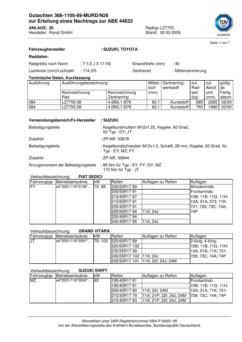 Dieses Gutachten (abe) bezieht sich auf die Alufelge Ronal LZ7755 in der Ausführung 2Jx17 ET 0, Mittenloch 0 mm (KBA 44622). Im PDF findest du typischerweise zulässige Reifengrößen, Auflagen/Anbauhinweise und – je nach Dokument – Hinweise zur Eintragung.