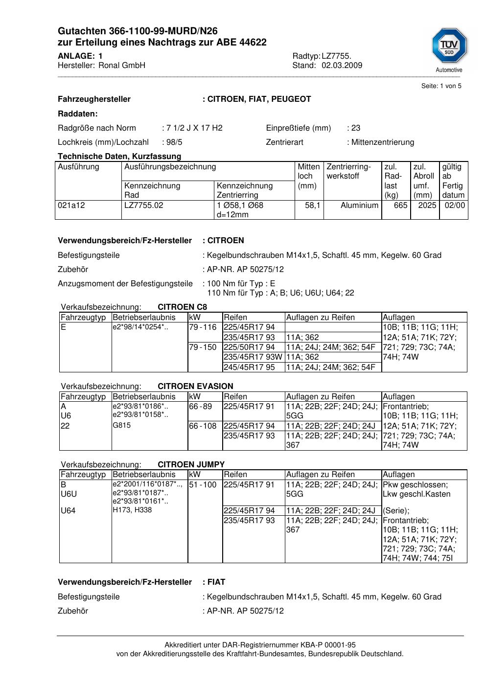 Dieses Gutachten (abe) bezieht sich auf die Alufelge brand-ronal LZ7755 in der Ausführung 2Jx17 ET 0, Mittenloch 0 mm (KBA 44622). Im PDF findest du typischerweise zulässige Reifengrößen, Auflagen/Anbauhinweise und – je nach Dokument – Hinweise zur Eintragung.