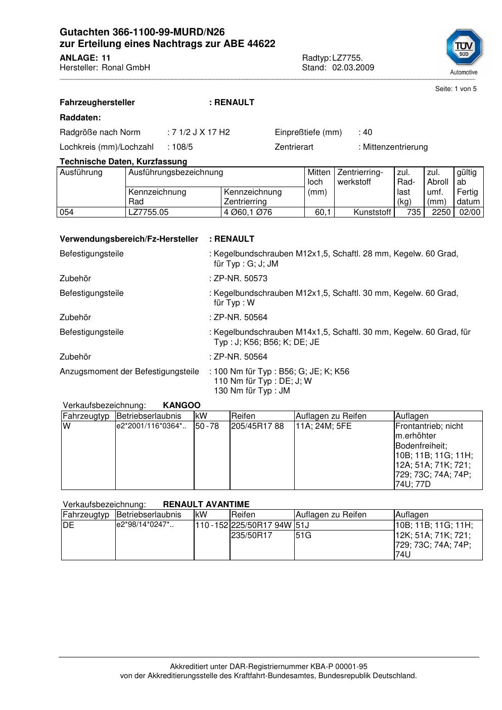 Dieses Gutachten (abe) bezieht sich auf die Alufelge Ronal LZ7755 in der Ausführung 2Jx17 ET 0, Mittenloch 0 mm (KBA 44622). Im PDF findest du typischerweise zulässige Reifengrößen, Auflagen/Anbauhinweise und – je nach Dokument – Hinweise zur Eintragung.